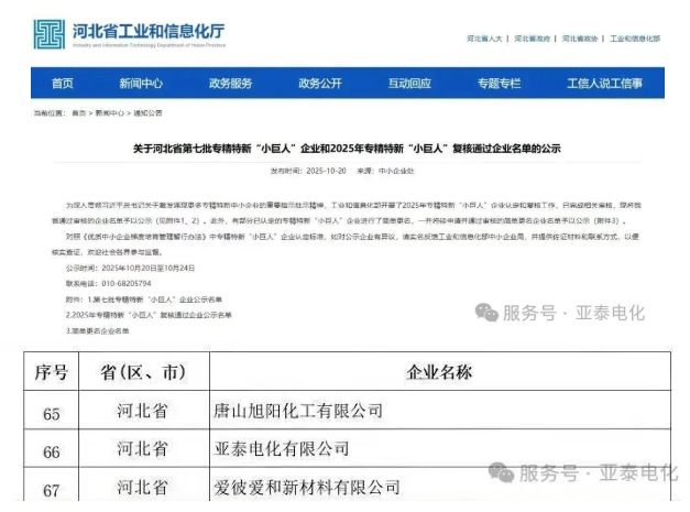 近日,河北省工業(yè)和信息化廳發(fā)布關于河北省第七批專精特新“小巨人”企業(yè)和2025年專精特新“小巨人”復核通過的企業(yè)名單,亞泰電化有限公司作為第四批認定的專精特新“小巨人”企業(yè),憑借在細分領域的不斷積累與持續(xù)創(chuàng)新能力,順利通過2025年專精特新“小巨人”企業(yè)復核認定。此次復審通過,標志著公司在專業(yè)化發(fā)展、技術創(chuàng)新實力與未來成長潛力方面獲得了長足的進步,即是對企業(yè)以往成績的肯定,也是對未來企業(yè)發(fā)展的鞭策。